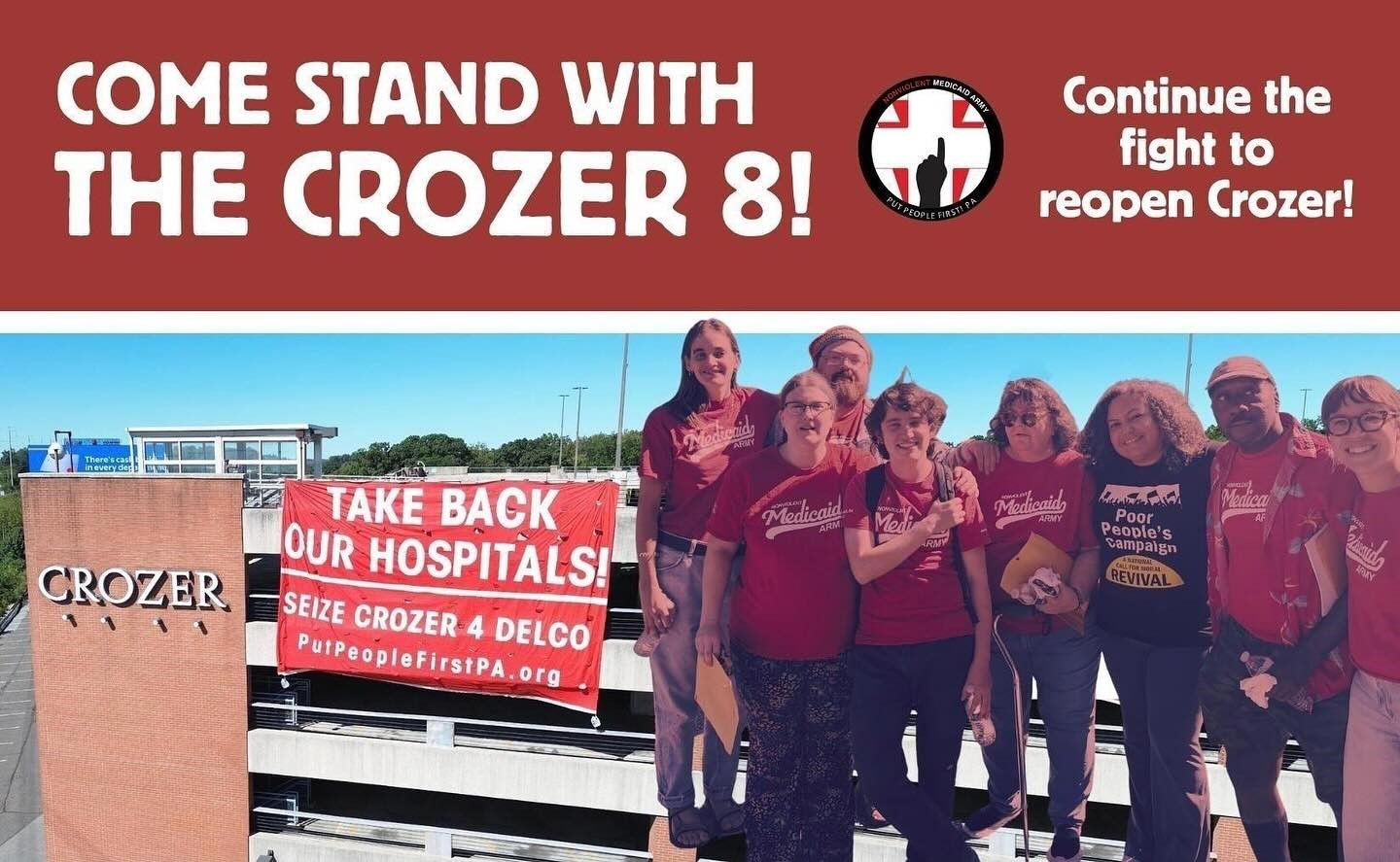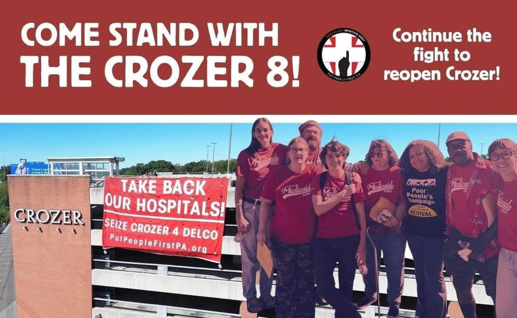 Who are the Crozer 8? On Monday, September 8, 2025, fifty people, including former workers and patients, held a rally in front of the closed Crozer-Chester Medical Center campus in Upland, PA. Eight of the protesters entered a medical office building within the complex that had not yet been completely shut down. They peacefully sat on one side of the lobby, taking care not to block foot traffic.