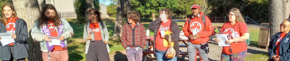 The Crozer 8 arrived this morning in red t-shirts, some half-hidden by jackets in the brisk autumn air. They offered donuts, coffee, and surplus t-shirts to supporters. Under trees near the courthouse, they conferred briefly with the lawyer representing all eight of them, then invited everyone to gather in a circle. Then each of the eight read a portion of a collective statement explaining their action and their hopes for just laws and healthcare for all. At the end, a minister among the Crozer 8 gave a short sermon, telling the story of the poor widow who pestered the unjust judge until he granted her justice (Luke 18:1–8). “We must do the same,” he urged. “We must take care of the needs of all.”